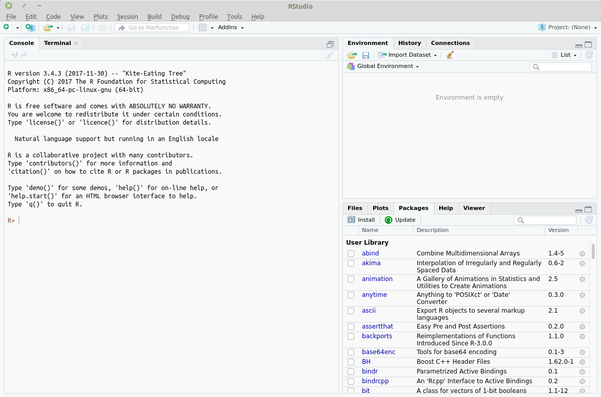 Open RStudio. It should open a window that looks similar to image below. (I am using a Linux machine)